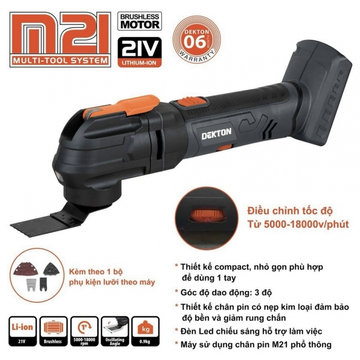 - Máy cắt rung đa năng Dekton M21-CDN01BL sử dụng động cơ không chổi than, đem lại hiệu suất hoạt động cao và tuổi thọ dài hơn so với các dòng máy sử dụng động cơ có chổi than. Với tốc độ không tải lên đến 18000 vòng/phút và khả năng điều chỉnh 6 cấp độ tốc độ, máy có thể dễ dàng xử lý các công việc từ cắt, mài, chà nhám đến đánh bóng trên nhiều loại vật liệu như gỗ, kim loại, nhựa và gạch.