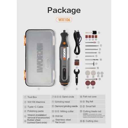 _Nhiều loại phụ kiện, làm việc chính xác. Độ ồn thấp (có 5 tốc độ). Tuổi thọ pin dài, an toàn và ổn định, kẹp ổn định (khóa bằng cờ lê), cắt có tia lửa nhỏ, không xẹp, không văng nước.