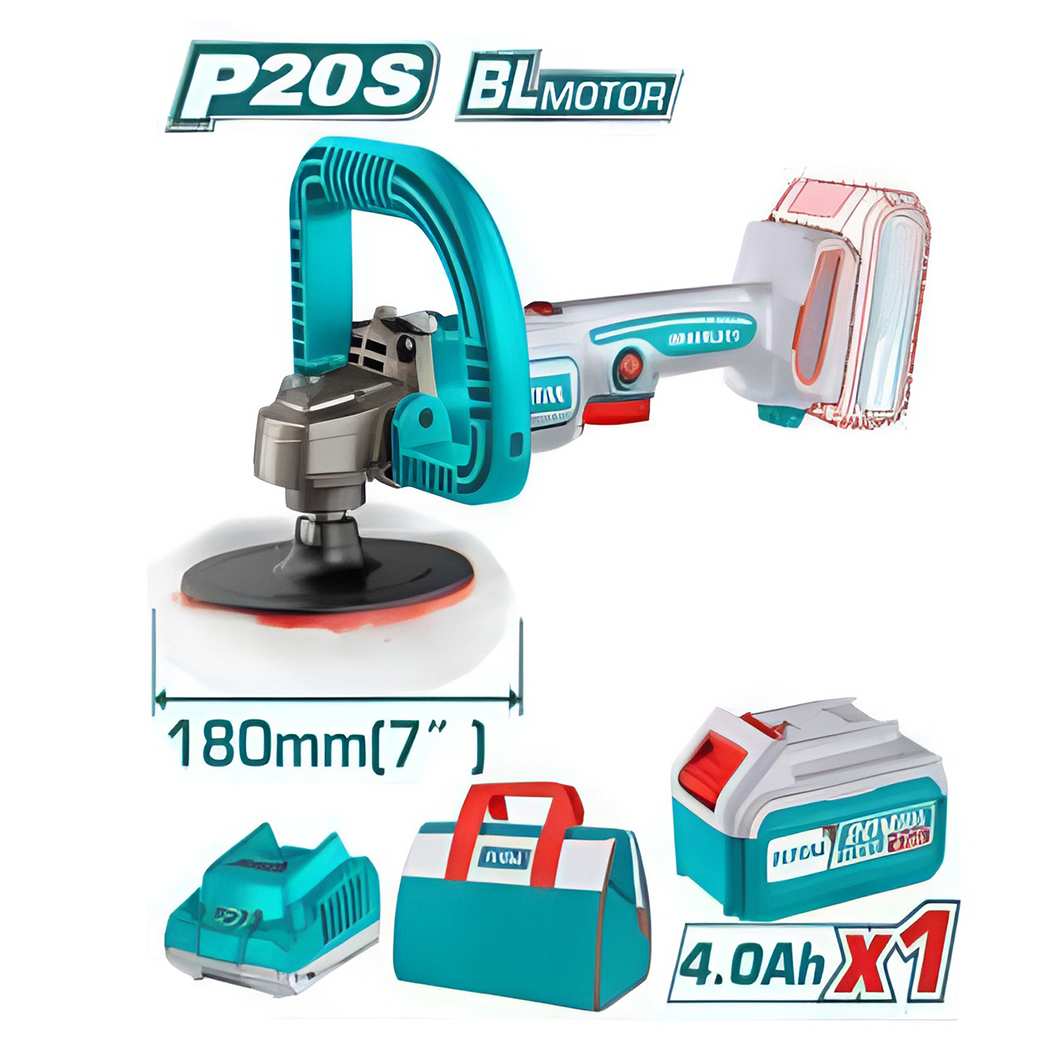 Mô tơ không chổi than Điện áp: 20V Tốc độ không tải: 800-2300 v/p Đường kính đĩa đánh bóng: 180mm Lỗ trục chính: M14 Kiểm soát tốc độ thay đổi Kèm theo: 1 tay cầm chữ D, 1 đĩa đánh bóng 1 pin 4.0Ah (TFBLI20021) 1 sạc (TFCLI2001) Điện thế sạc: 220-240V~50/60Hz Đóng gói trong túi vải
