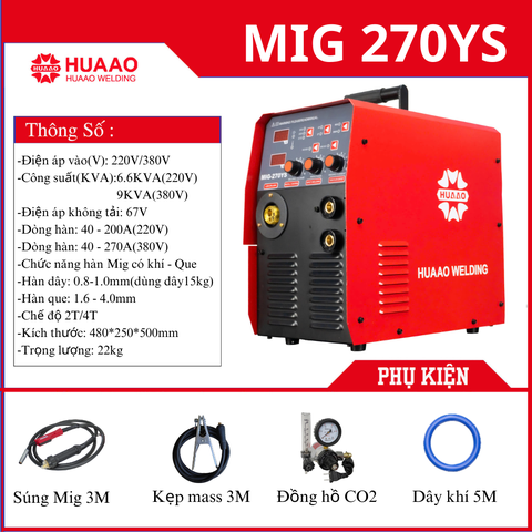 + Máy hàn Huaao Mig 270YS là mẫu máy hàn Mig 2 thể điện công nghệ mới . Tự động chuyển đổi điện áp 220V/380V .