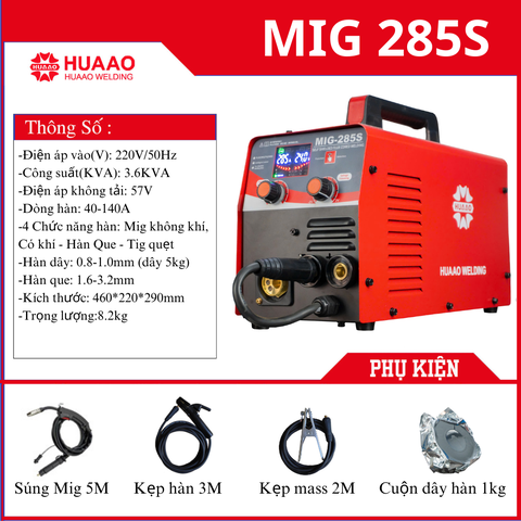 + Máy hàn Huaao Mig 285S có 4 chức năng hàn : hàn Mig có khí , hàn Mig không dùng khí, hàn que và hàn Tig quẹt.
