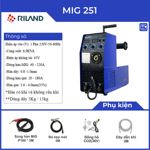 + Máy hàn Riland Mig 251 hàn bắn tóe ít , dây 0.8mm hàn điểm và hàn kéo cho mối hàn đẹp