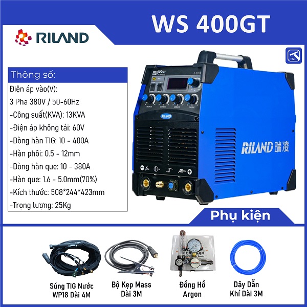 Riland WS 400GT là máy hàn Tig thế hệ mới của thương hiệu máy hàn điện tử RILAND , sử dụng nguồn điện 3 pha - 380V/50 - 60Hz, cho dòng hàn ổn định, công suất hàn vượt trội 13 KVA, có thể kéo dòng hàn lên tới 400A, giúp bạn hàn gang, hàn những tấm thép dày lên tới 12mm.