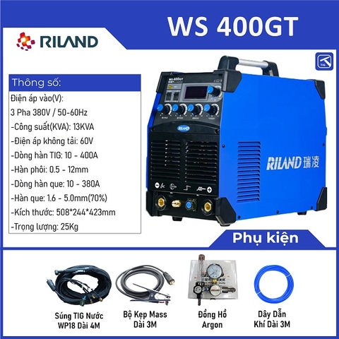 Máy hàn Riland Tig WS 400GT thuộc dòng máy hàn công nghiệp 380V, công suất vận hành mạnh mẽ 13 KVA, đáp ứng 2 chức năng hàn que/hàn Tig. Với dòng hàn 10 - 400A, cho thấy sức mạnh làm việc vượt trội của dòng máy này, có thể hàn đa dạng kim loại với độ dày, mỏng khác nhau.