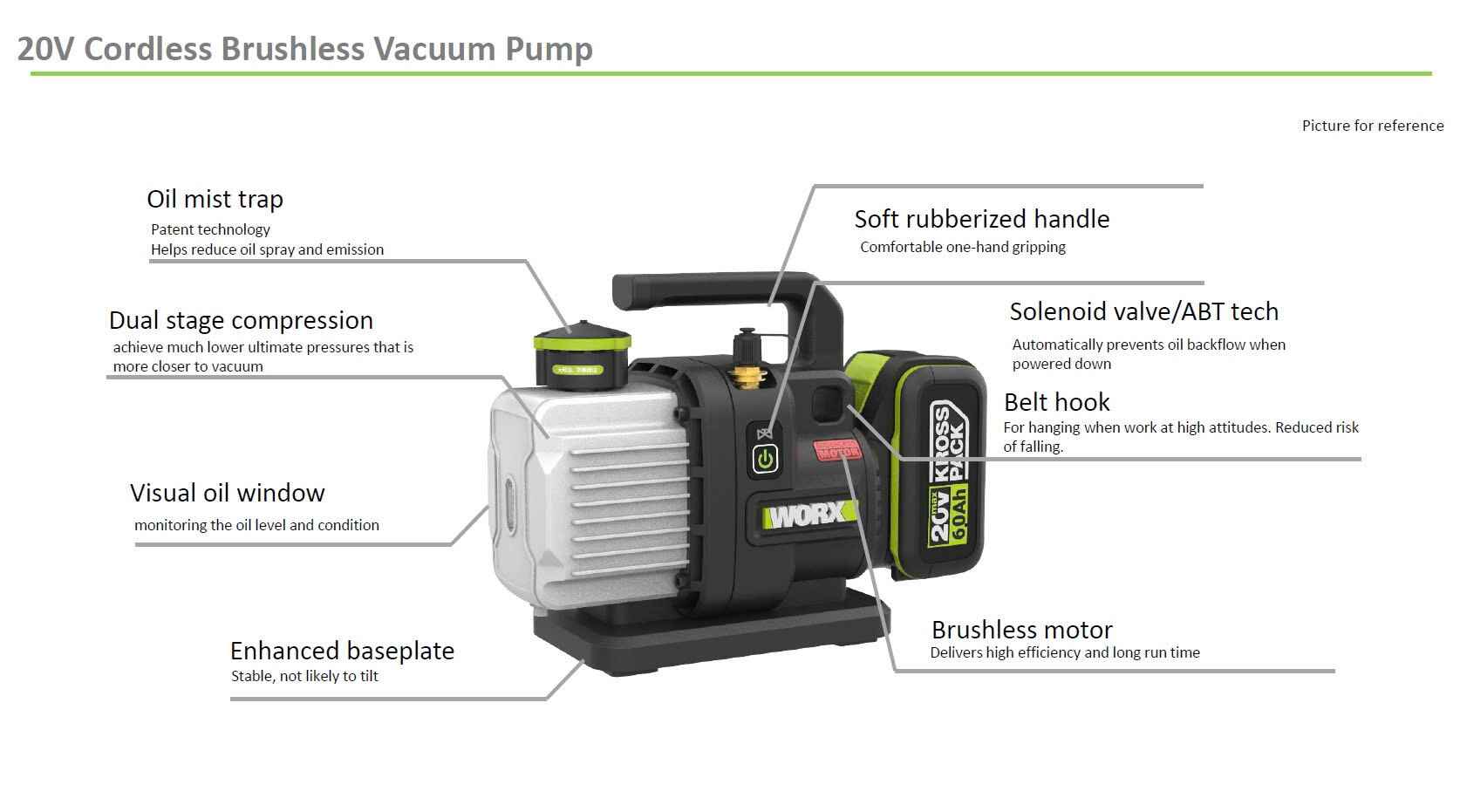 -Công nghệ ABT: Van điện từ tự động ngăn dầu chảy ngược khi tắt nguồn. Bẫy sương mù dầu giảm thiểu dầu bơm chân không bị phân tán từ cổng xả. Thời gian chạy dài 60 phút với pin 6.0Ah được sạc đầy, đủ để hoàn thành hầu hết các công việc thanh lọc
