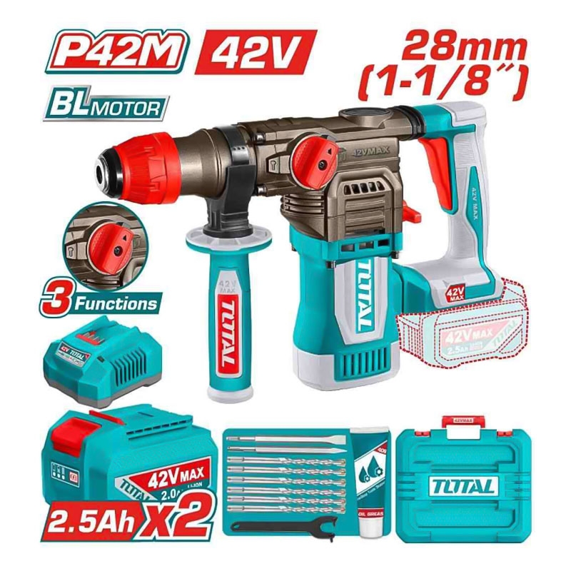Máy khoan bê tông dùng pin 42V TOTAL TRHLI422882 sở hữu mô tơ không chổi than, năng lượng va đập lớn 4.5J, khoan tối đa bê tông 28mm, tốc độ 0–900 vòng/phút. Máy khoan bê tông trang bị 2 pin 2.5Ah, sạc nhanh, kèm đầy đủ phụ kiện giúp đáp ứng mọi nhu cầu khoan, đục chuyên nghiệp tại công trình.