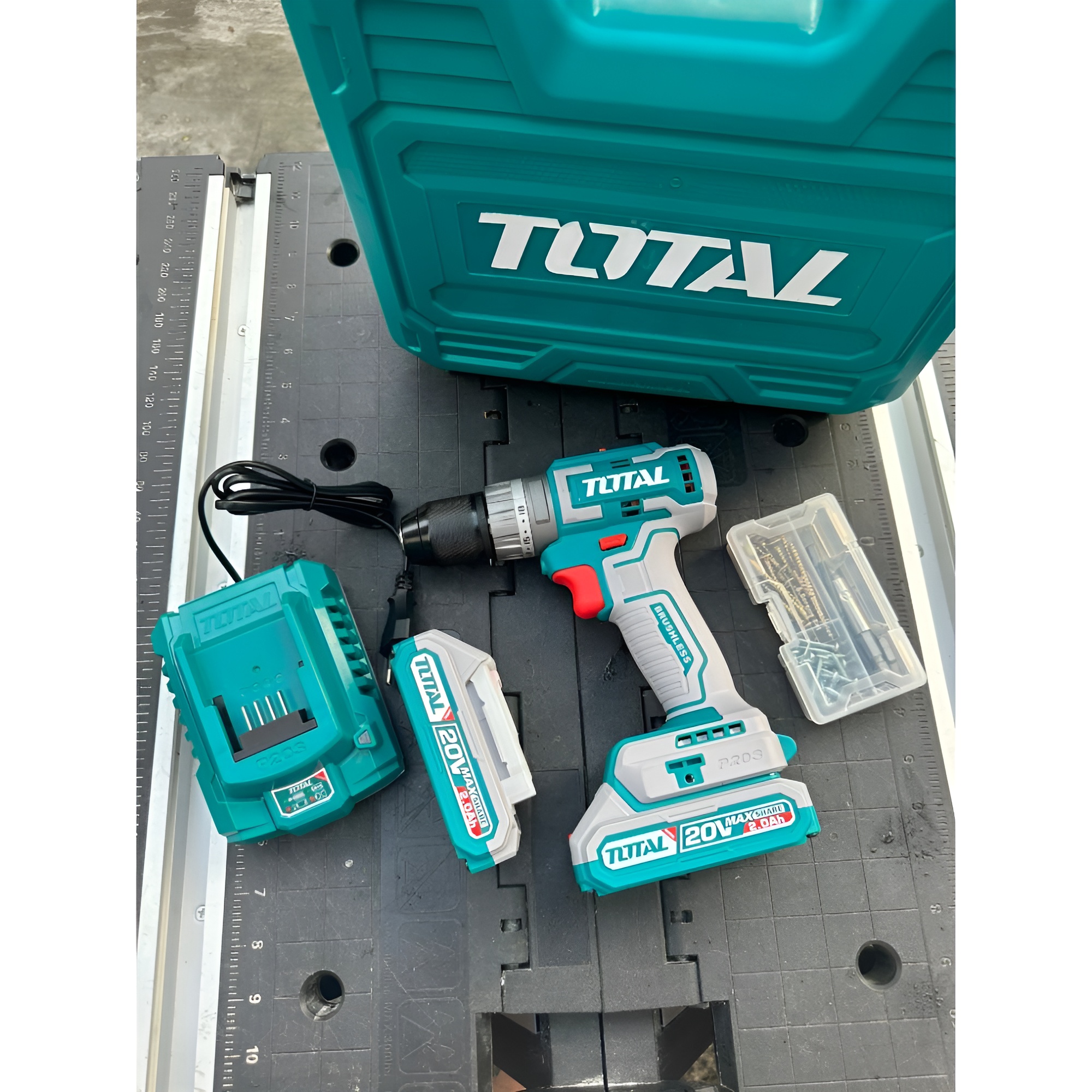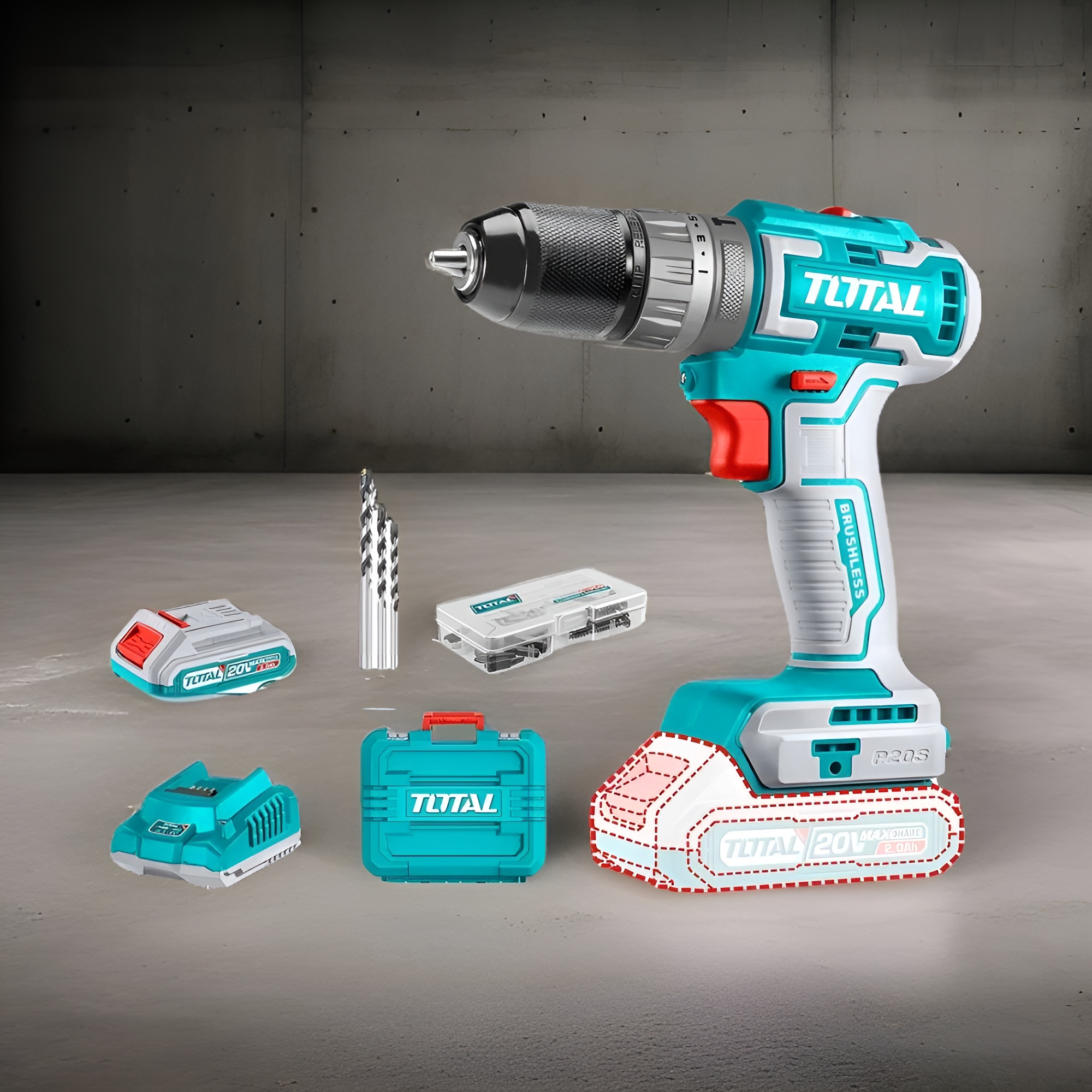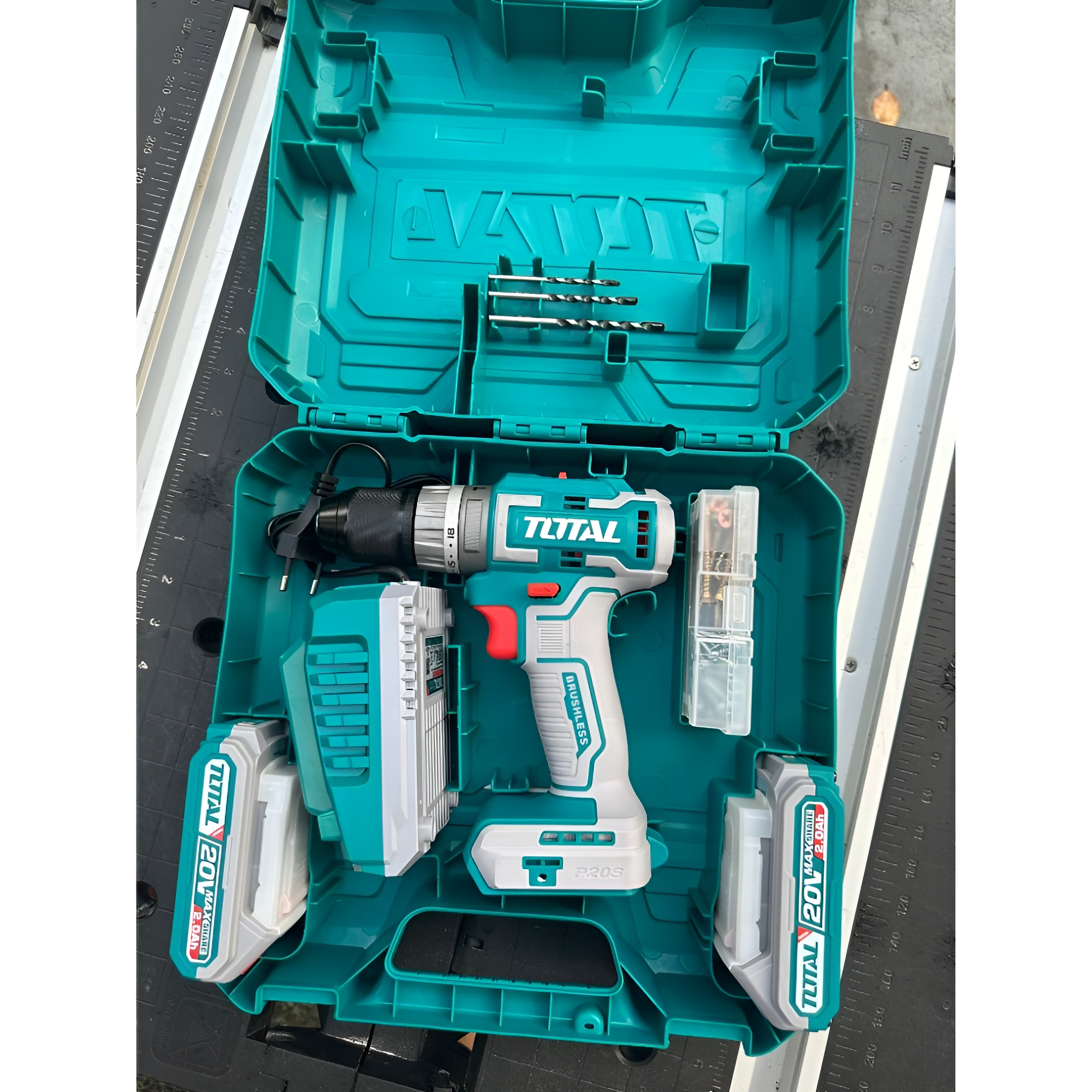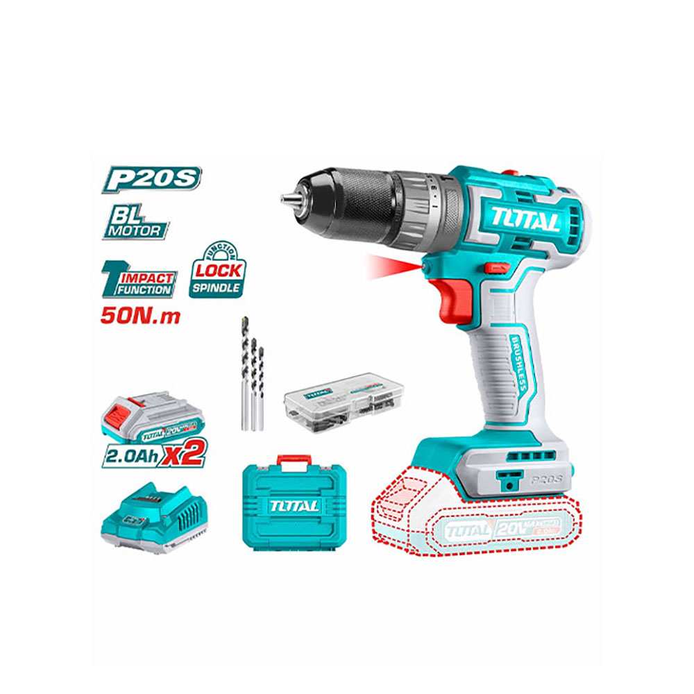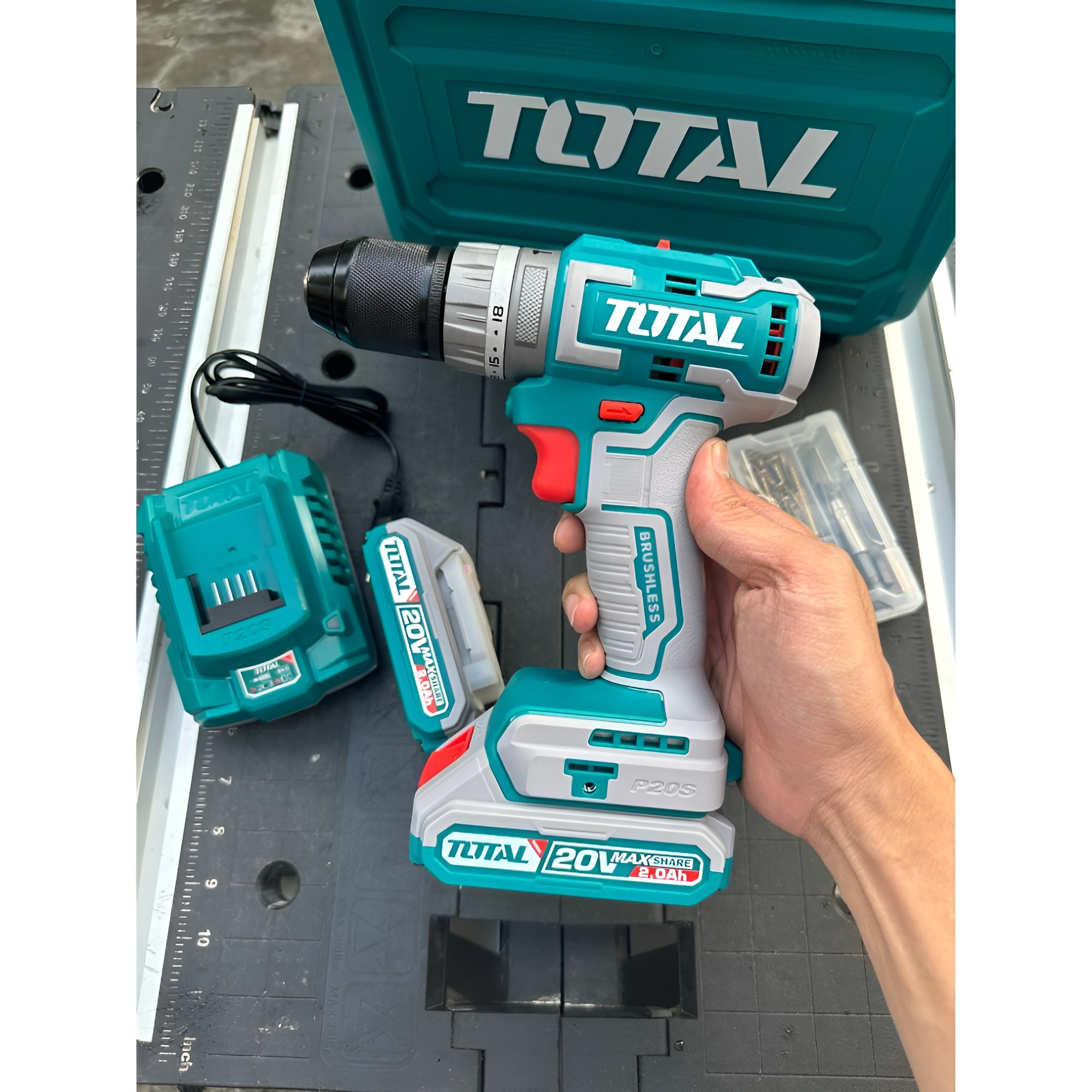 Mô tơ không chổi than. Điện áp: 20V Tốc độ không tải: 0-450/0-1800rpm Tốc độ tác động tối đa: 27000bpm. Mô-men xoắn tối đa: 50Nm Khả năng khoan: 0,8-10mm. Thiết lập mô-men xoắn: 18+1+1 Bánh răng cơ khí 2 tốc độ. Chức năng khóa trục chính. Đầu khoan khóa tự động. Điện áp sạc: 220-240V~50/60Hz Đèn làm việc tích hợp. Đèn báo nguồn pin LED Kèm theo: 2 pin 2.0Ah (TFBLI20011), 1 sạc (TFCLI2001) và 47 linh kiện, 3 mũi khoan gạch. Đóng gói trong hộp nhựa