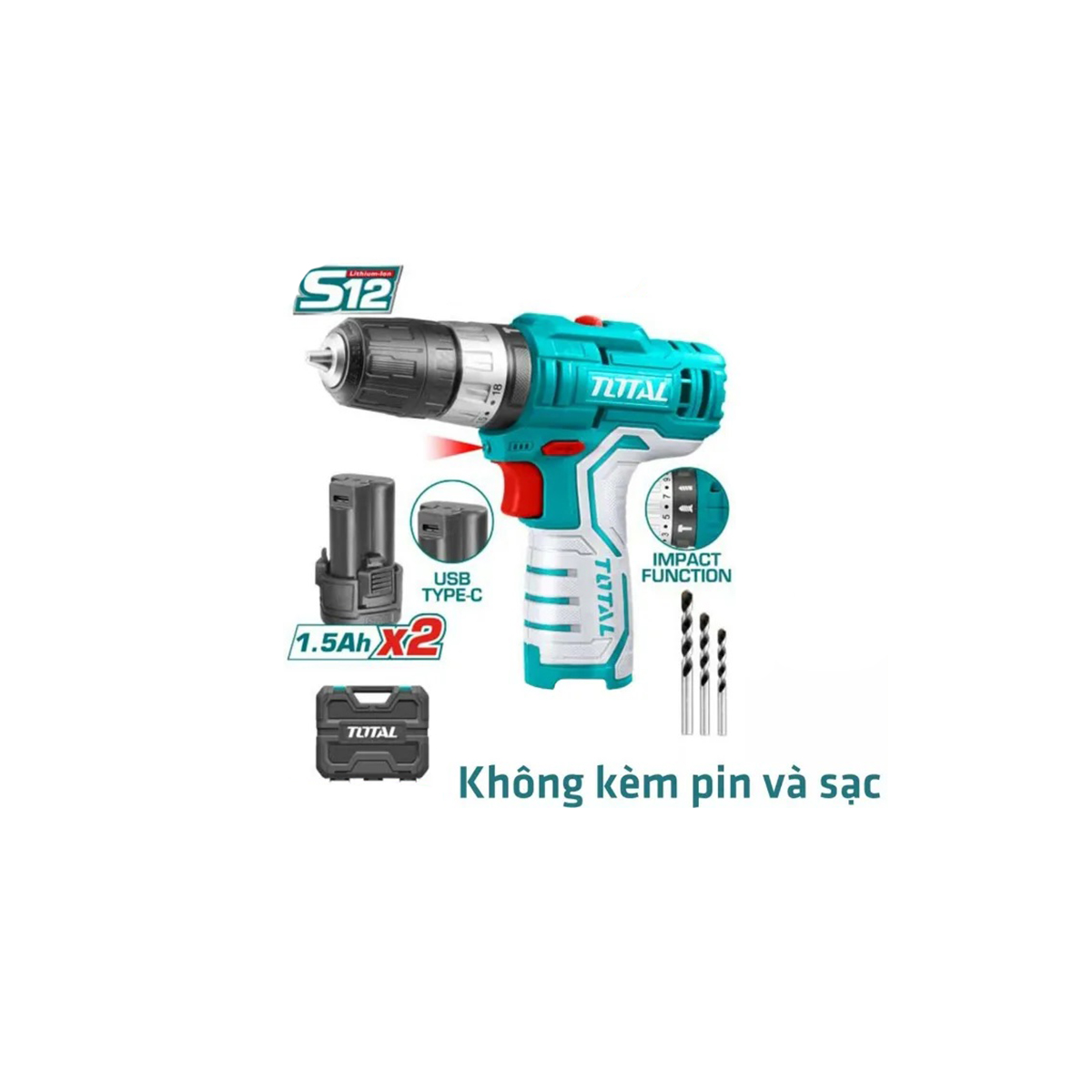 Điện áp: 12V. Tốc độ không tải: 400/0-1500rpm. Tốc độ tác động tối đa: 22500/phút. Mô-men xoắn tối đa: 20Nm Công suất mâm cặp: 0,8-10mm. Cài đặt mô-men xoắn: 18+1+1 Đèn LED làm việc. Kèm 2 pin 1.5Ah (TBLI12153), 1 mũi vít Cr-V 65mm, 3 mũi khoan tường Cổng sạc Pin: USB loại-C. Không kèm dây sạc và đầu sạc.