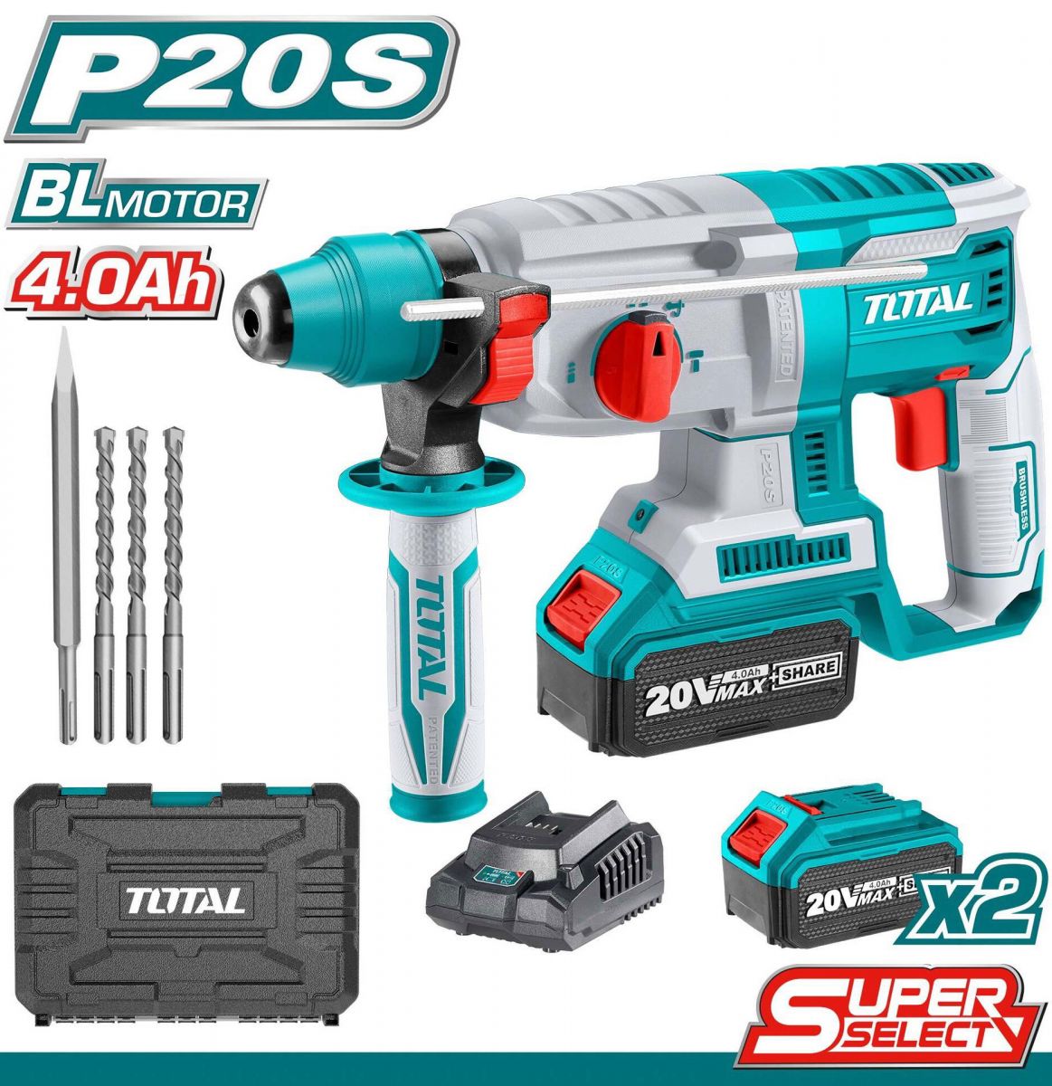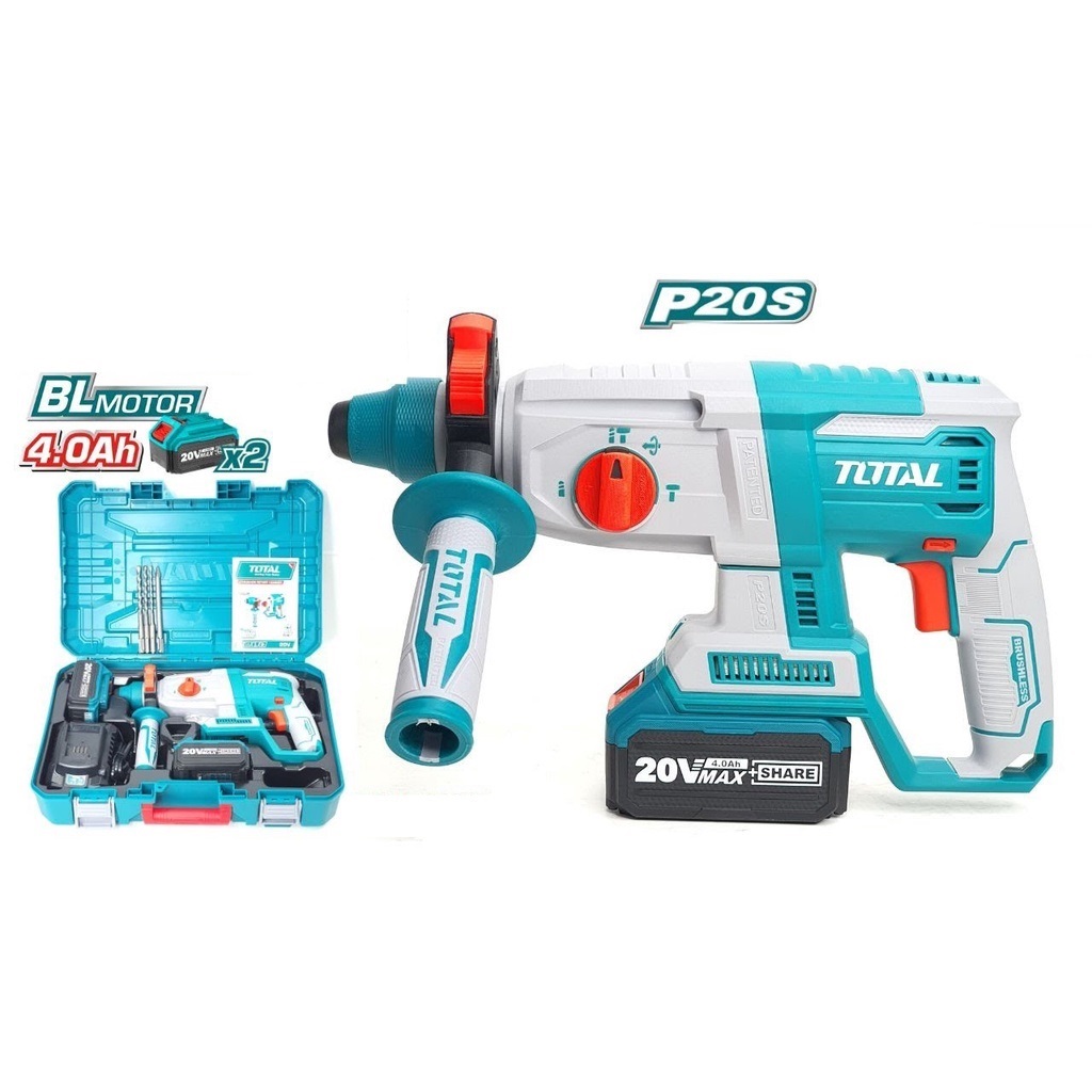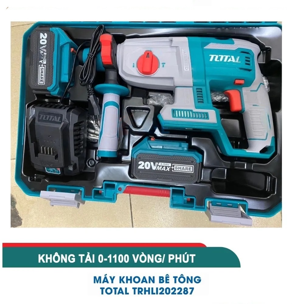 Mô tơ không chổi than, Điện thế: 20V. Tốc độ không tải: 0-1100 vòng / phút. Tốc độ tác động: 0-5000 / phút. Lực tác động đơn: 2.0J. Khả năng khoan bê tông tối đa: Φ26 Đèn làm việc tích hợp, đầu gài SDS plus Kèm 3 mũi khoan và 1 mũi đục Kèm 2 pin 4.0Ah và 1 sạc. Điện thế: 220V-240V ~ 50 / 60Hz