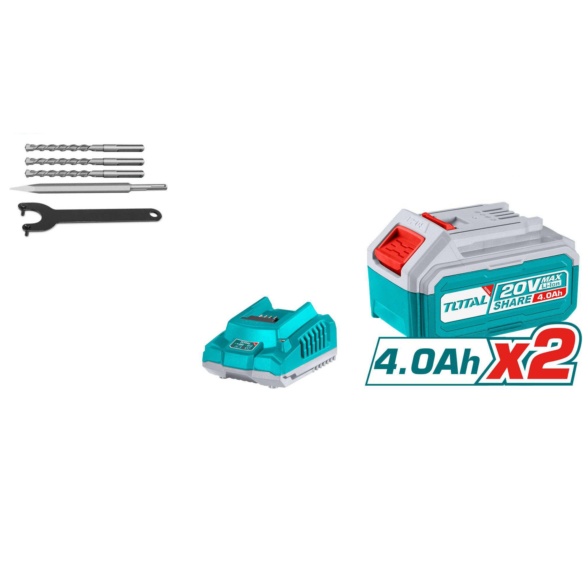 | Thông số phụ kiện | Kèm 3 mũi khoan, 1 mũi đục, Kèm 2 pin 4Ah (TFBLI2002), 1 Sạc . |
