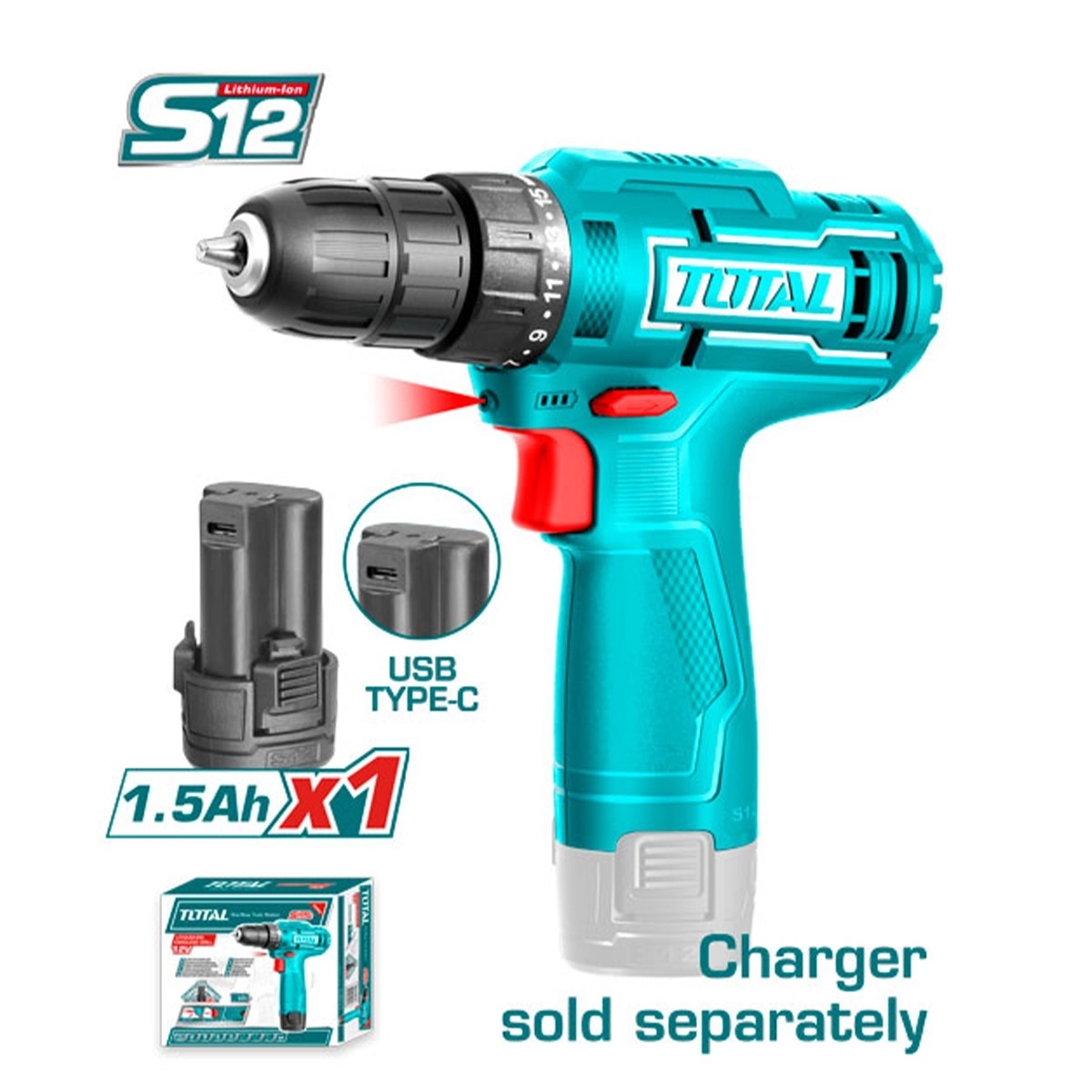 Điện thế: 12V. Tốc độ không tải: 0-750rpm Mô-men xoắn tối đa: 20NM. Khả năng khoan: 0,8-10mm Thiết lập mô-men xoắn: 15 + 1. Đèn làm việc tích hợp Kèm 1 pin 1.5Ah TBLI12153 có cổng sạc USB loại C. Không kèm sạc. Đóng gói trong hộp màu