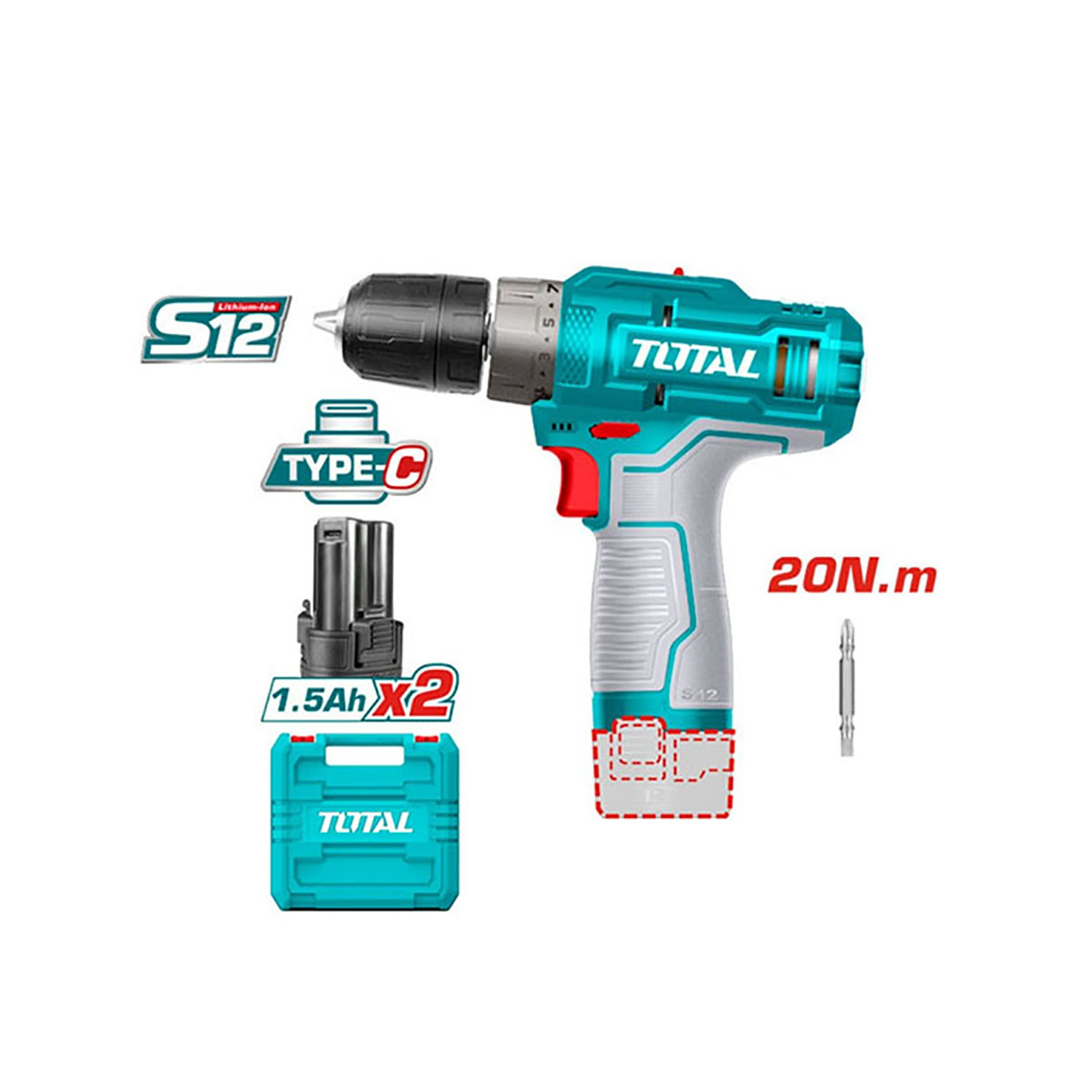 Điện áp: 12V. Tốc độ không tải: 0-400/0-1500rpm Mô-men xoắn cực đại: 20Nm. Đầu khoan nhựa Khả năng khoan: 0,8-10mm. Thiết lập mô-men xoắn: 15+1. Hộp số cơ 2 tốc độ. Đèn LED làm việc Bao gồm: 1 mũi khoan Cr-V 65mm 2 pin 1.5Ah (TBLI12153). Cổng sạc pin: USB type-C. Sạc được bán riêng. Đóng gói trong hộp nhựa