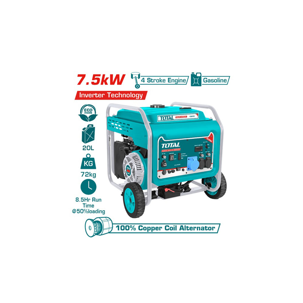 Công nghệ biến tần. Điện áp định mức: 220-240V Tần số định mức: 50Hz Công suất tối đa: 7,5kW Công suất định mức: 7,2kW Đầu ra sóng hình sin thuần túy (dao động±3%) Hiển thị chữ số (Hrs, Hz, V) Với công tắc đặt lại. Có đèn báo 3 trong 1 (quá tải + đầu ra + đèn báo dầu) Kèm 1 DC 12V; 2 USB tích hợp Động cơ: xi lanh đơn, 4 thì, OHV Mô tơ dây đồng