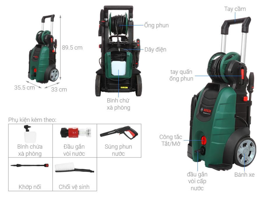 - Tiện ích: Máy phun xịt rửa áp lực cao Bosch Advanced Aquatak 140 được thiết kế với tay cầm chắc chắn và dây nguồn dài, giúp bạn dễ dàng sử dụng và di chuyển trong quá trình làm việc.