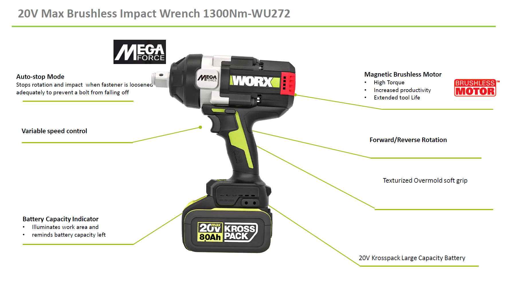 _Thân máy siết bu lông pin 20V mang lại hiệu suất cao và lực siết tối đa lên đến 1.300 N.m. Động cơ không chổi than với mô-men xoắn cao, tăng năng suất, tăng tuổi thọ cho máy.