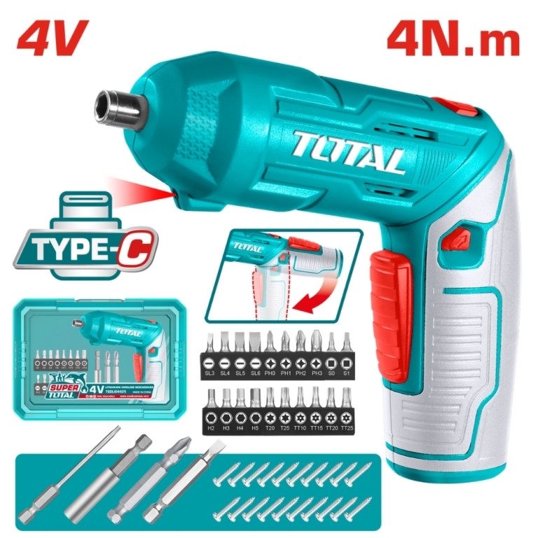 Điện áp: 4V. Chui lục giác: 1/4". Tốc độ không tải: 240rpm. Mô-men xoắn cực đại: 4N.m. Tay cầm có thể điều chỉnh hai vị trí. Sạc qua dây sạc USB loại C (dây sạc được bán riêng). Đèn làm việc tích hợp. Bao gồm: 20 mũi khoan Cr-V 25mm + giá đỡ, 2 mũi khoan Cr-V 50mm + giá đỡ, 1 mũi khoan Cr-V 74mm, 1 đầu nối. Đóng gói trong hộp nhựa.