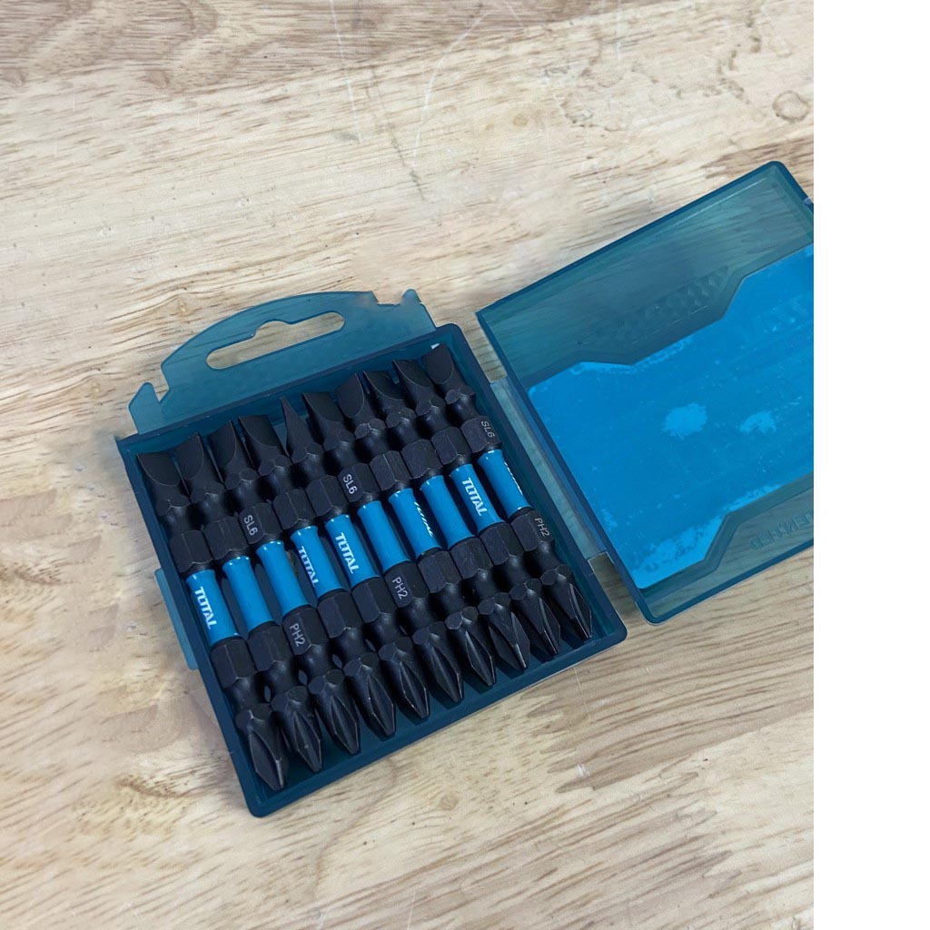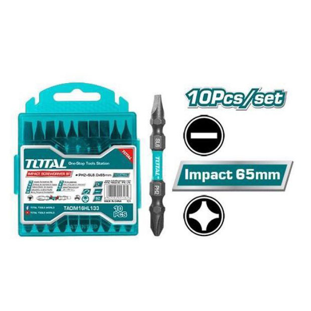 Mũi bắt vít hai đầu PH2+SL6.0*1.0x65mm. 10 cái / bộ. Đầu vít được tối ưu hóa lớn hơn giúp giảm gãy đầu, chất liệu bằng thép công nghiệp S2. Bề mặt đen có nam châm. Đóng gói bằng hộp nhựa.
