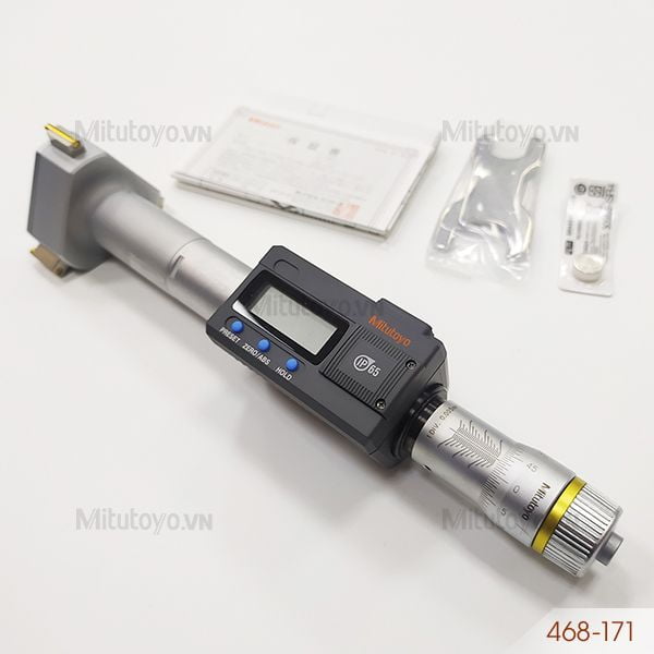 - Panme đo lỗ 3 chấu điện tử Mitutoyo 468-171 được thiết kế gọn nhẹ có khoảng đo 62 - 75mm, độ hiển thị 0.001mm, độ chính xác ±4µm với với bề mặt đế được thiết kế bằng thép dụng cụ đo có hệ số giãn nở nhiệt thấp, thông qua 3 chấu dễ dàng xác định đường kính trong với độ chính xác, độ ổn định phép đo cao.