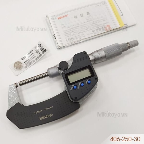 - Panme đo ngoài Mitutoyo 406-250-30 được thiết kế gọn nhẹ có khoảng đo 0 - 25mm đo hệ metric, độ hiển thị 0.001mm cùng với độ chính xác ±3 μm. Sản phẩm phù hợp để đo độ dài, đường kính bên ngoài của các chi tiết tròn, độ dày vật liệu trong các ngành kỹ thuật như xây dựng, cơ khí chế tạo máy, khuôn mẫu, ô tô, nội thất, …với độ chính xác cao.