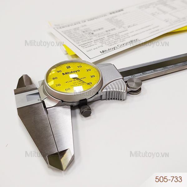 - Thước cặp cơ khí Mitutoyo 505-733 được làm bằng thép dụng cụ đo có hệ số giản nở nhiệt thấp, bề mặt trượt được đánh bóng với thanh trượt thiết kế cải tiến. Do đó thiết bị có thể di chuyển nhẹ nhàng và mang lại các kết quả đo chính xác, độ ổn định phép đo cao.