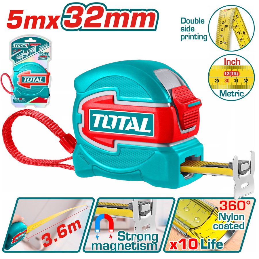 Thước kéo Total TMT80532 dài 5 mét với nền màu vàng nổi bật thiết kế để thao tác dễ dàng ngay cả trong điều kiện ánh sáng yếu. Lưỡi thép 32mm được phủ nylon dày giúp bảo vệ phần số và vạch chia khỏi trầy xước, tăng độ bền về lâu dài.